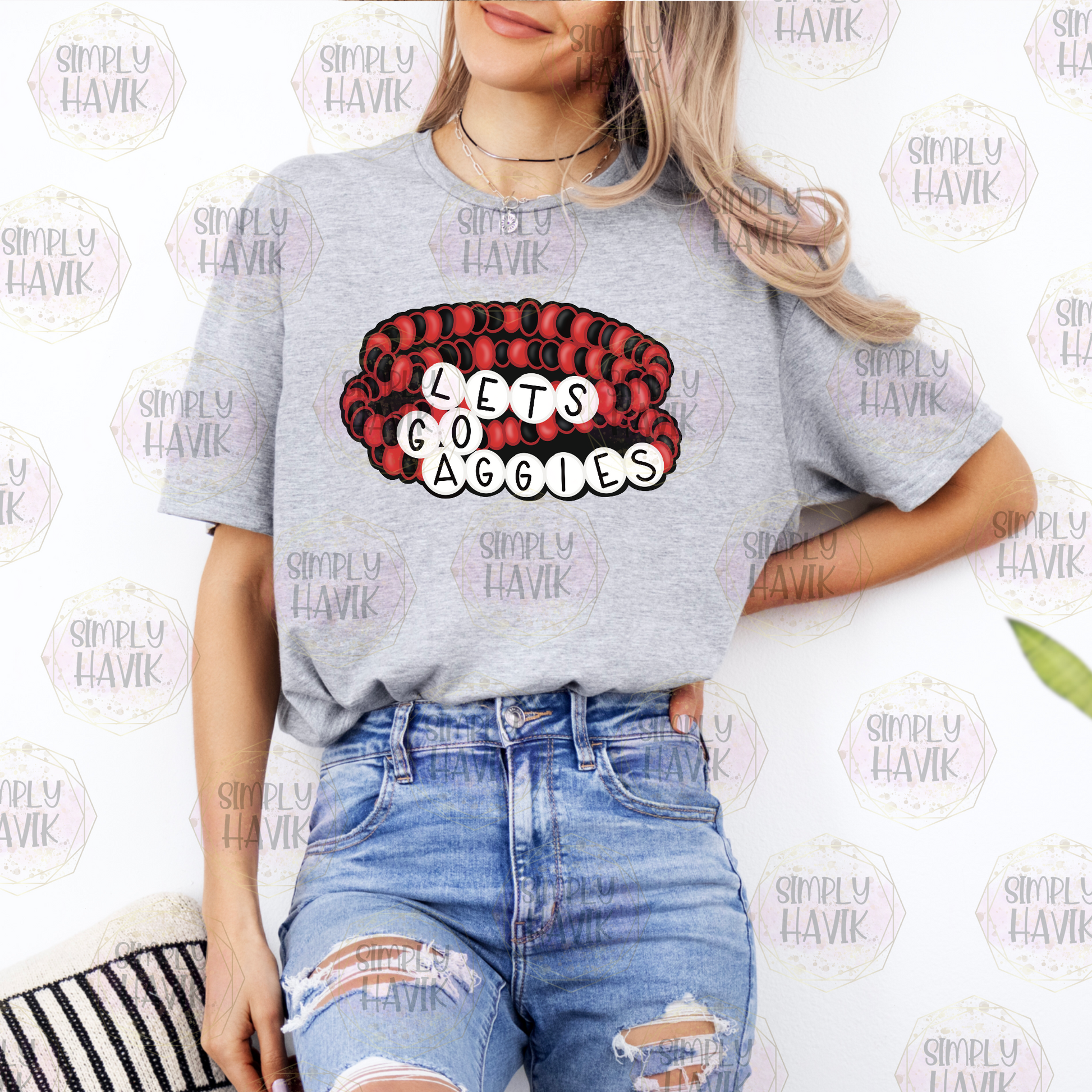 Join the Aggie nation with our Let's Go Aggies shirt. Show off your school pride and style with this comfortable and versatile shirt. Perfect for game days, events, or everyday wear, it's a must-have for any Aggie fan. Go Aggies!