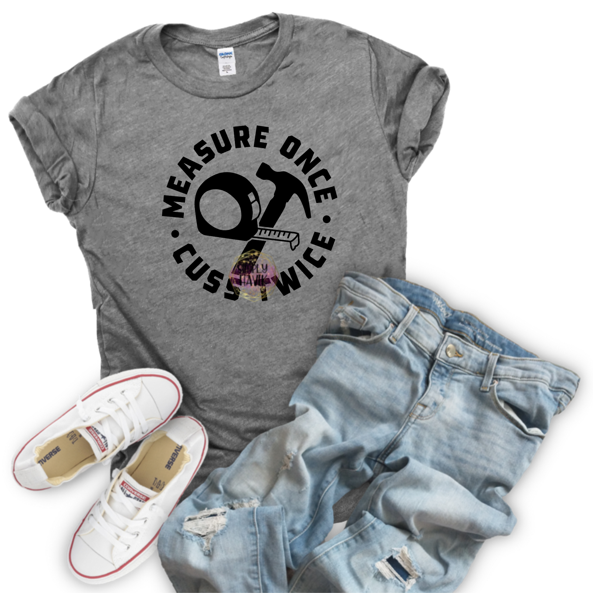 Unleash your wild side and take the risk of wearing the Measure Once Cuss Twice shirt. Look good and make a statement with bold graphics and unique style. Express your adventurous spirit and don't be afraid of making mistakes - measure once, cuss twice.